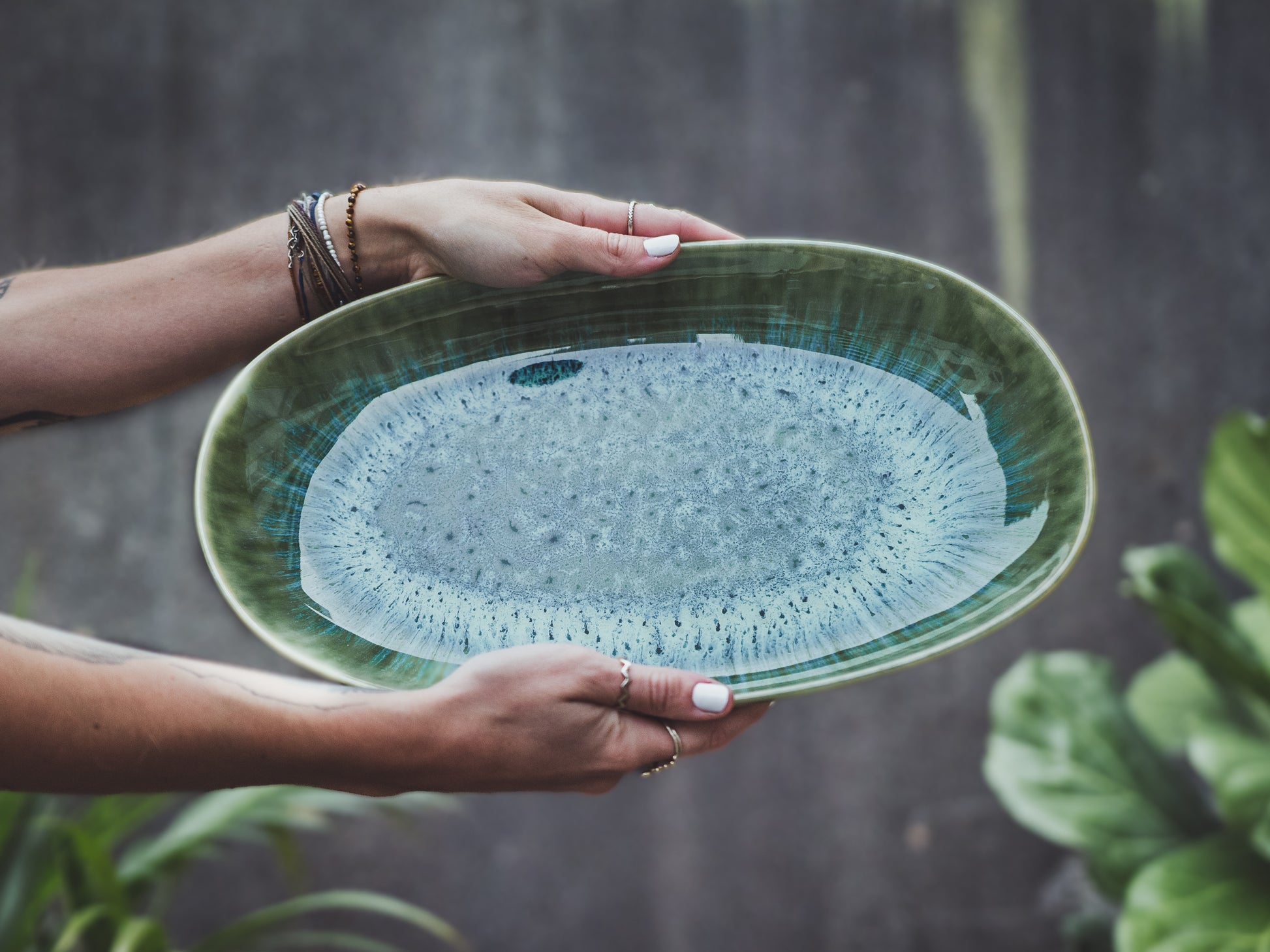 Vulcão Verde – „grüner Vulkan“ – ist mehr als ein Name: Die reaktive Glasur dieser handgefertigten Servierplatte erinnert an kraftvolle Natur und lebendige Kultur Portugals. Mit ihren liebevollen Details und dem einzigartigen Farbverlauf wird sie zum Blickfang auf jedem Tisch. Ideal zum stilvollen Anrichten von Speisen und für besondere Genussmomente – ob für Apéros, Hauptgerichte oder Desserts.