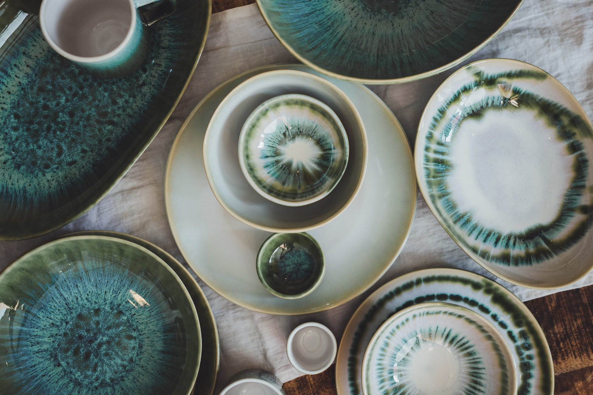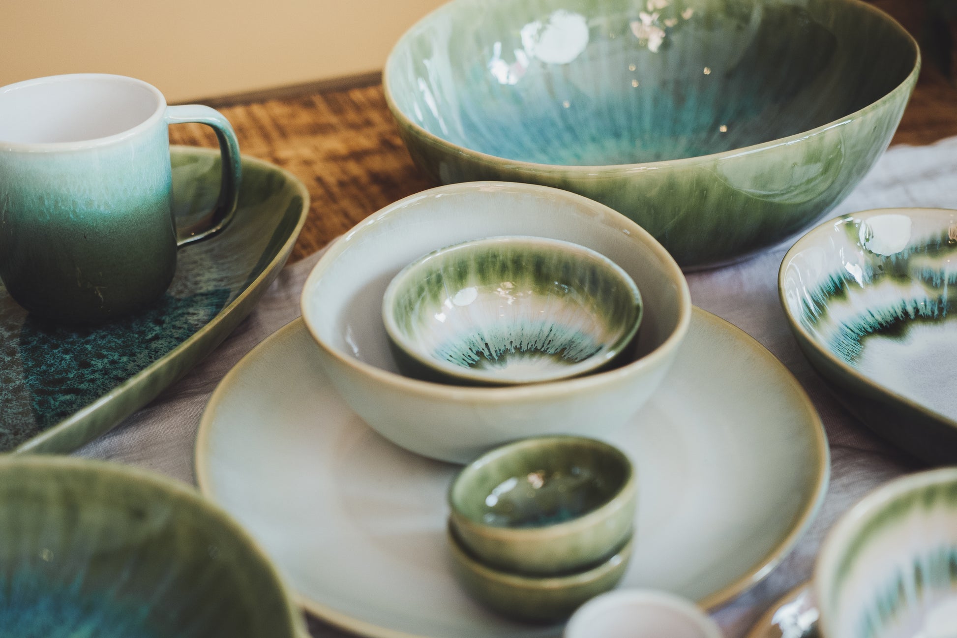 L'assiette Aguarela Verde est une assiette vert pastel avec des dégradés de couleurs réactives blanches et bleues. Elle nous rappelle les levers de soleil et les doux reflets de l'eau.